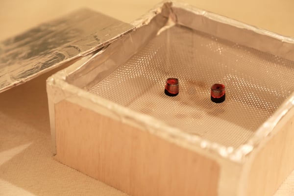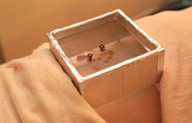 おなかや、腰、背中に専用の特殊な箱を置いて、その中にお灸をするんです。