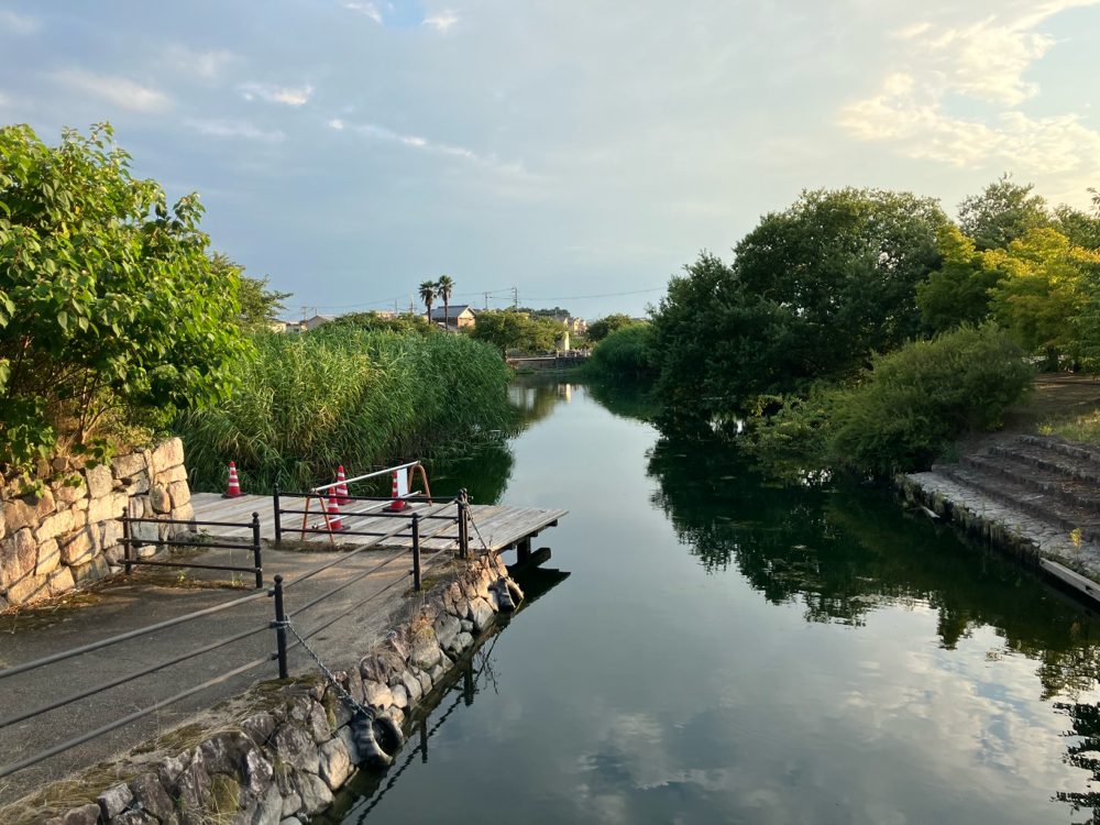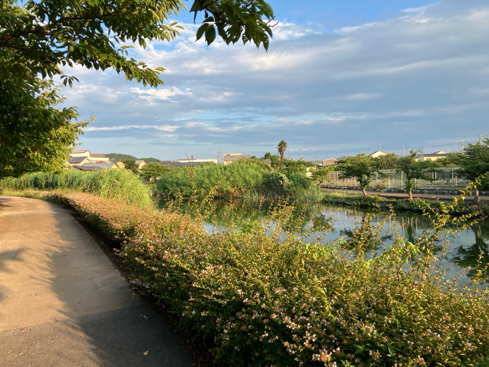 川沿いに歩道があり、木々やヨシの自生など緑も豊富で、この季節は朝や夕方の散策にもおすすめのスポットです。県道2号線からすぐなので、立ち寄りやすくもあります。