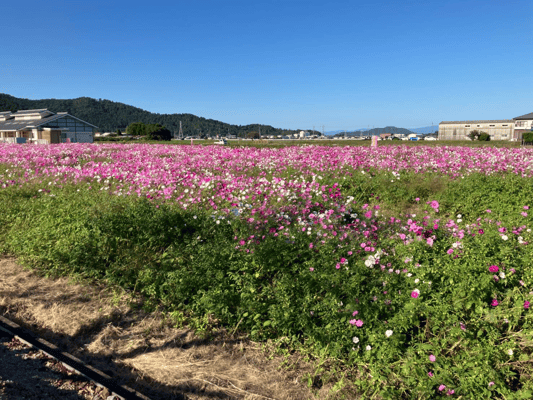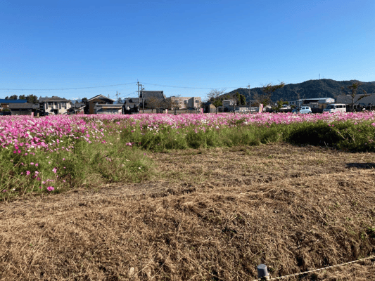 先日、東近江市五個荘町にあるコスモス畑を訪れました。お米を収穫した後の田圃にコスモスが植えられたもので、近江八幡や東近江の各所にこういった畑が毎年見頃を迎えています。